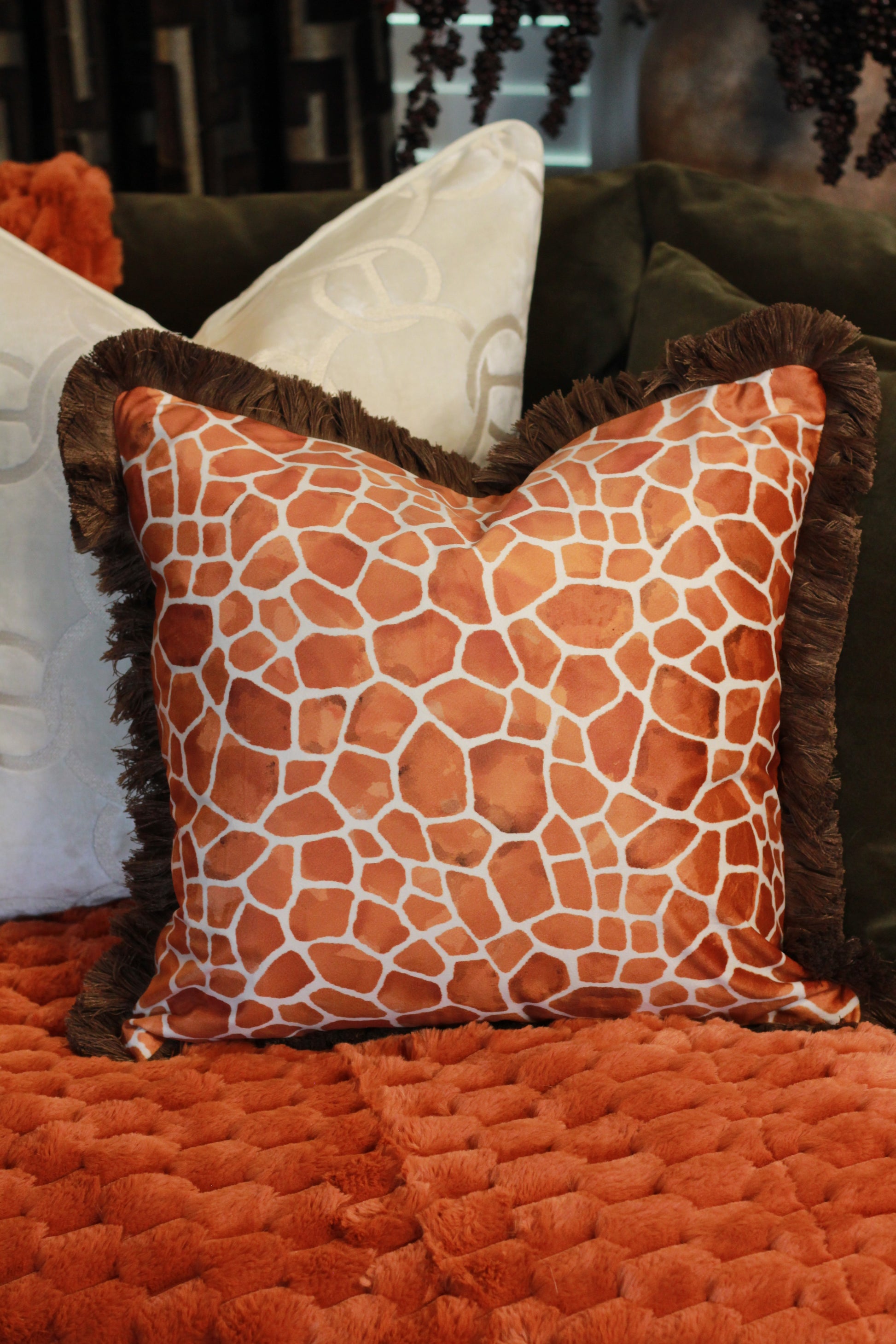 Make a bold statement with this giraffe print cushion. Featuring warm orange and cream tones framed with a rich fringe trim, it brings a playful yet sophisticated accent to your interiors. Feather-filled for comfort, it’s perfect for layering with plains or pairing with other patterned designs.